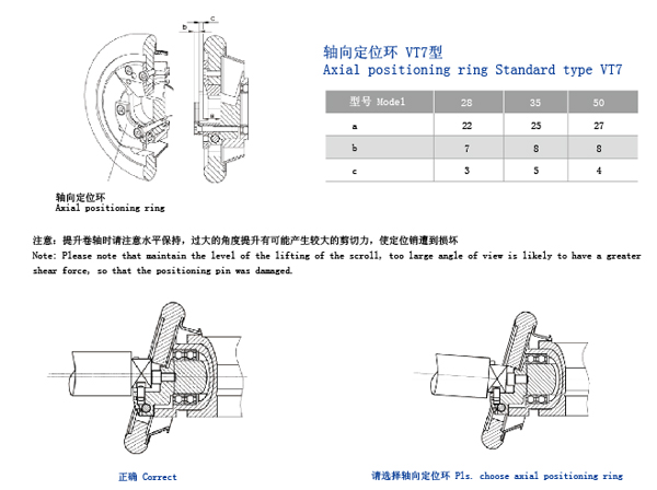 注意:提升軸卷請(qǐng)注意水平保持,過大的角度提升可能產(chǎn)生較大的剪切力,使定位銷遭到損壞。note:poeasc note that maintain the level of the lifting of the scroll,too large angle of viev is likely to have a greater shear force,so that hte positioning pin was dammged.
