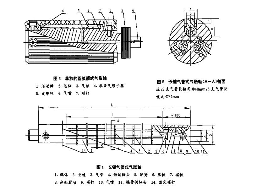 第一類圖 1、圖2 中,輥俸通常為無縫鋼管車制,一種輥面鉆有圓孔,另一種為銑制雙圓頭長孔,輥體內裝有氣胎,氣胎外面為 4~6 片金屬條(無璉鋼管銑割而成)分幾段,氣胎兩端用密封套、密封墊.藉螺母收緊把端部封住,有一端裝有氣管、氣嘴。突鈕式圓柱頭或葉片式平鍵均固定在金屬條上,突鈕式的,金屬條鉆圓孔后用銅焊連接,而葉片式平鍵滑塊的,金屬條銑一長凹槽,平鍵滑塊從槽中推進用彈簧片確定其位置.保證平鍵精塊在輥體孔中伸縮移動自如.然后金屬條用銅焊連接 ,為了保證氣胎有較長壽命與惜塊收縮刊最低位置,在氣胎內裝入一支圓柱形輕質棒料(鋁管、硬塑料管、木料),特別在氣胎直徑較大,長度較長,停用時中間部份膠管可防止內壁粘連,過早造成折邊、龜裂。