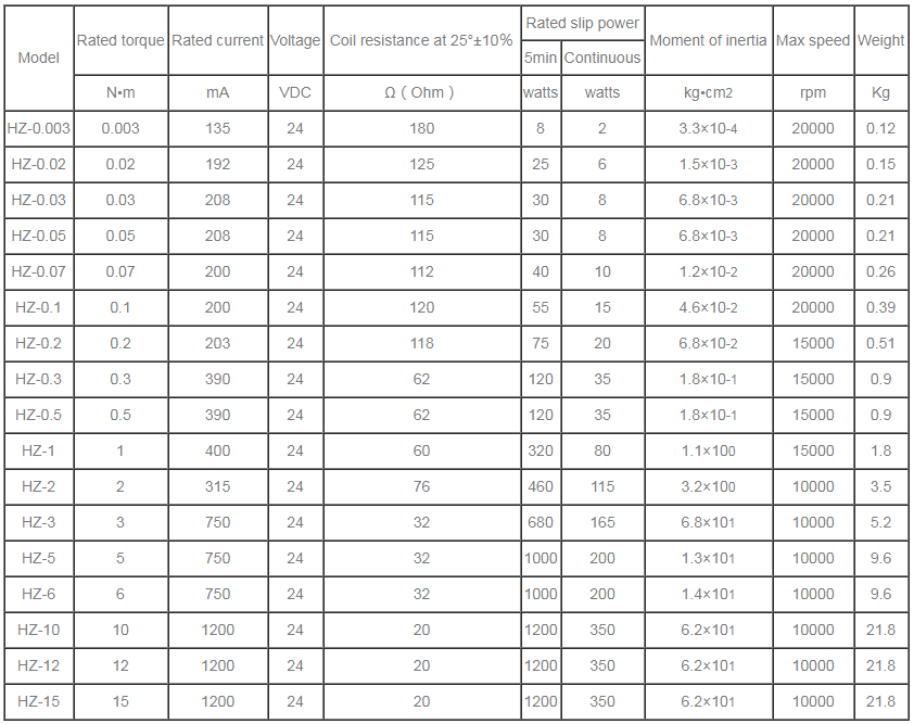 Excitation current is basically linear with the output torque,which can be controlled within 5-100% of the rated value.Large ou Calculation method In the case of winding processing,tension control is often required. The actual tension on the wire and strip at this time is determined by the following formula. F=M÷R F─tension N(Newton) R─material roll radius m(m) M─torqueN•m(N•m) During the operation of hysteresis brake, the power consumed is converted into heat . If the rated slip power is exceeded , the device will be damaged by overheating. Slip power P=M×n÷9.55=F×v